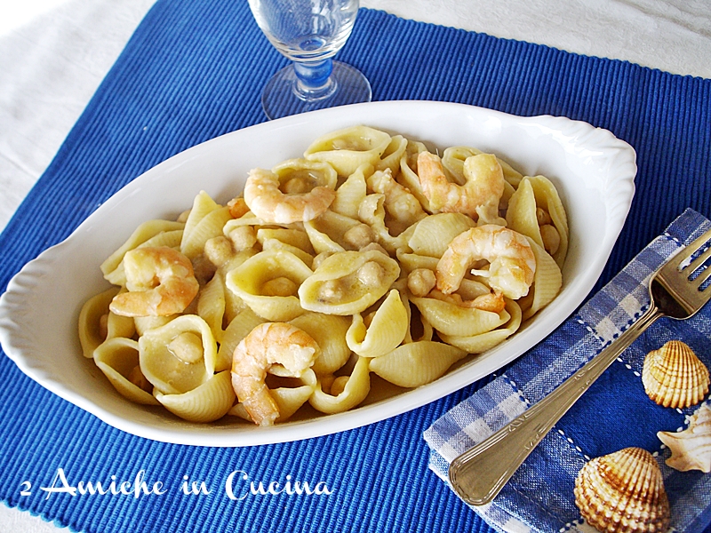 Buongiorno, il primo di oggi è a base di gamberetti e ceci, una parte dei ceci viene frullata per dare cremosità alla pasta. Primo semplice ma saporito, a noi è piaciuto molto e le conchiglie sono adattissime ad accogliere la passatina di ceci.